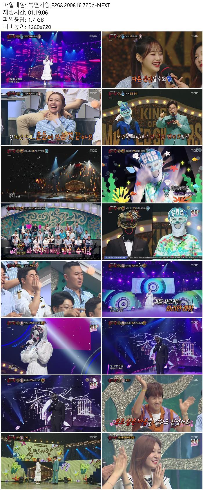 - 복면가왕.E268.200816.720p-NEXT.mp4 (1.7G) 다운로드 : 18,592