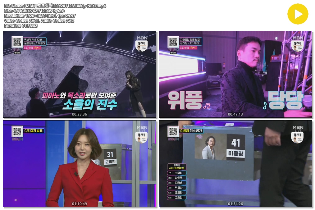 • [MBN] 로또싱어.E09.201128.1080p-NEXT.torrent (4.4G) 다운로드 : 29,877