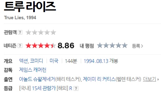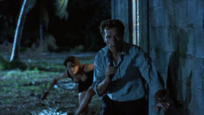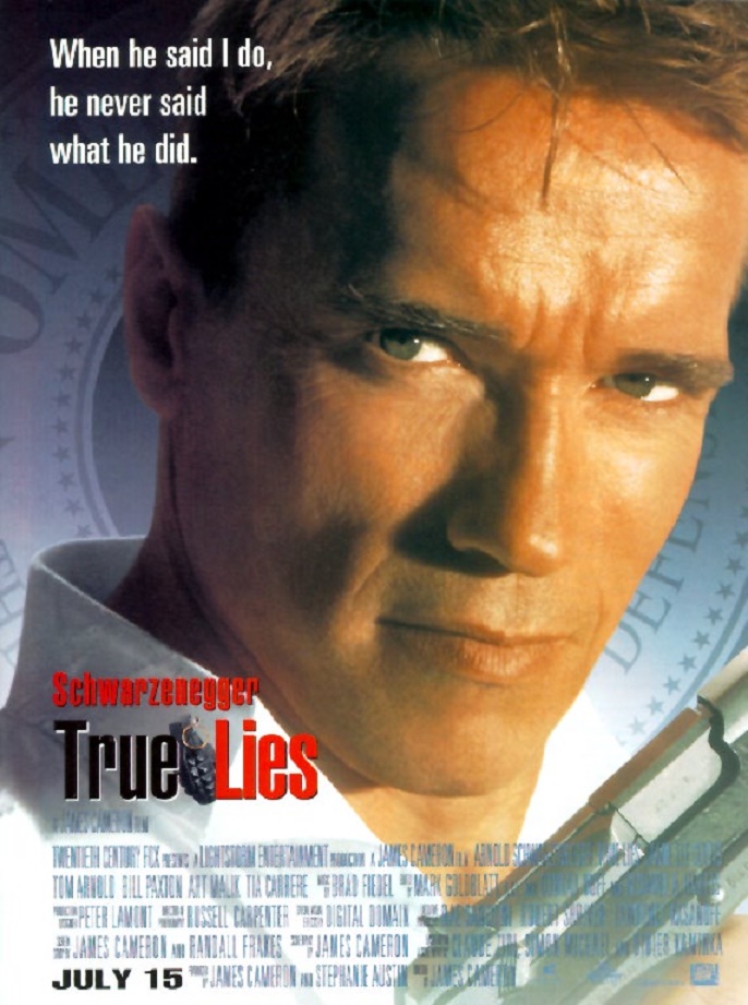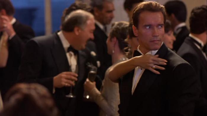 눈덮인 스위스 제네바의 어느 풍치있는 고성에서 파티가 화려하게 열리고 있었다. 성 주위를 총을 지닌 병사들이, 도베르만 맹견을 데리고 경비하고 있다. 성 앞, 얼음이 언 연못의 한 곳이 갈라지고, 잠수복을 입은 남자가 나타났다. 해리 타스카(Harry Tasker: 아놀드 슈왈제네거 분). 핵테러리즘 전무늬 미합중국 최고비밀기관 오메가 섹터의 스페셜 에이전트이다. 이번 임무는 성 안의 컴퓨터에서 극비 데이터 화일을 입수하는 것. 멀리 떨어진 언덕 위에는 동료인 깁이 잠시 스코프를 통해 망을 보고 있다. 여하간 성 안으로 잠입해 파티장으로 뒤섞여 들어가 임무를 성공한다. 그러던 중 한 여성과 시선이 교차한다. 그녀의 이름은 주노. 고대 페르시아를 전문으로 하는 고미술상이다. 경비병이 소란스럽다. 들켜버린 것이다. 해리는 옆에 있던 주노와 탱고를 추면서 그 장소를 벗어난다. 정문으로 당당하게 퇴장하려고 하는데 경비병이 불러세워, 담배갑의 폭파 스위치를 누른다. 폭음과 동시에 해리는 돌진한다. 도베르만과 스노모빌을 탄 경비병의 추격에 총격으로 웅전. 눈 속을 달리고, 미끄러지고, 넘어지고, 겨우 동료인 깁과 합류할 수 있다. 그리고 워싱턴 DC의 아내가 기다리는 자기 집으로 돌아온다.
