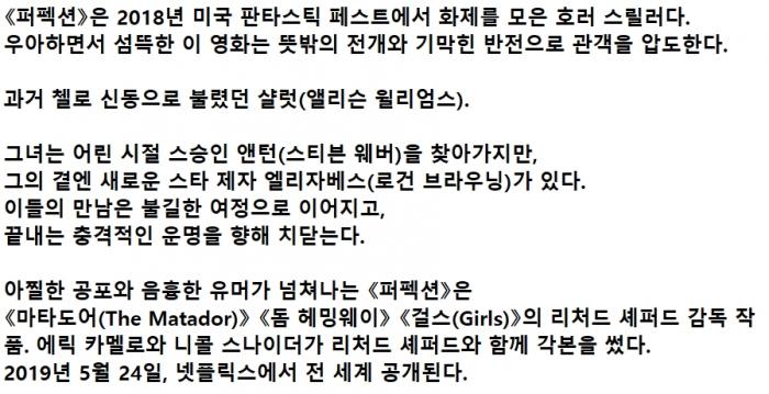 영화 2019 충격적 반전의 2019 충격적 반전의 결말 샬럿의 도발 1080p 자막유 에센티아 2026-01-01 3,192 2.7G 다운로드 2개 파일 The.Perfection.2018.1080p.NF.WEB-DL.DD5.1.H264-CMRG.mkv 2.7G 다운 The.Perfection.2018.1080p.NF.WEB-DL.DD5.1.H264-CMRG.smi 다운 추천 587 북마크 공유 목록